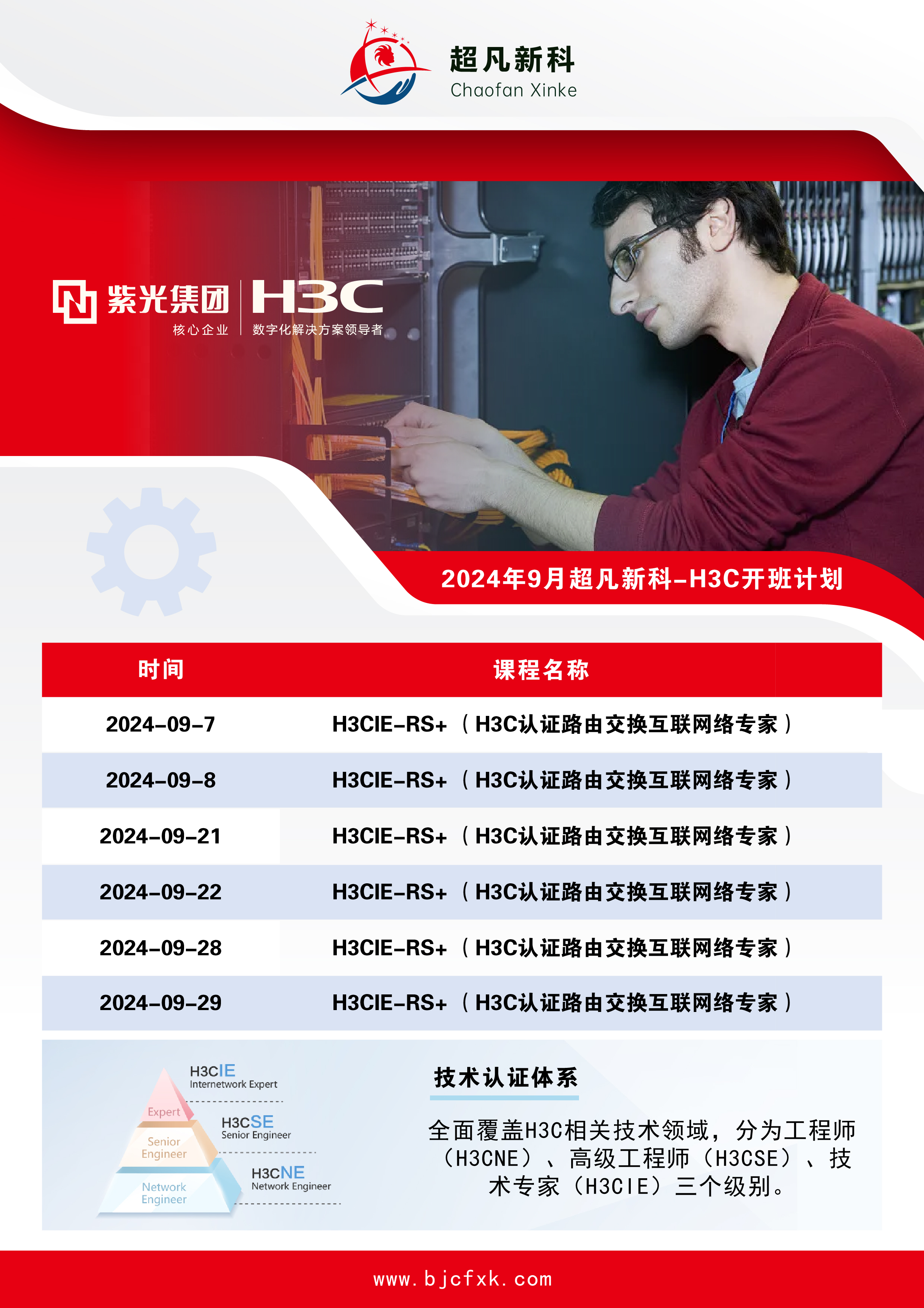 H3C认证路由交换网络工程师)认证主要定位于IP网络技术基础,依托H3C路由器和交换机等网络设备设计了大量实验,有助于学员迅速、全面地掌握路由交换相关的基础知识和技能,具备使用H3C网络设备设计和搭建中小型网络的能力,并对网络技术前沿技术有一定的了解,为学员网络技术能力提升打基础并提供指引。